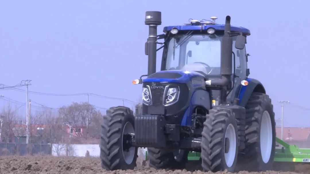 位于山东省平度市的中国青岛幸福生态观光园里,一台雷沃拖拉机正在地里迅速行驶,来回穿梭耙地、平地作业。