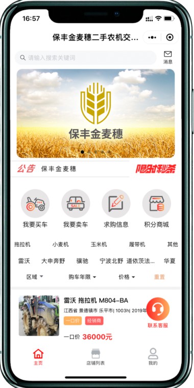 随着我国农机保有量的不断增多,二手农机交易市场规模也越来越大,但二手农机缺乏正规的定价参考,处理方式仍不完善。为实现资源精准对接,满足客户各类场景下对二手农机设备的交易需求,潍柴雷沃倾力打造了保丰金麦穗二手农机交易平台。