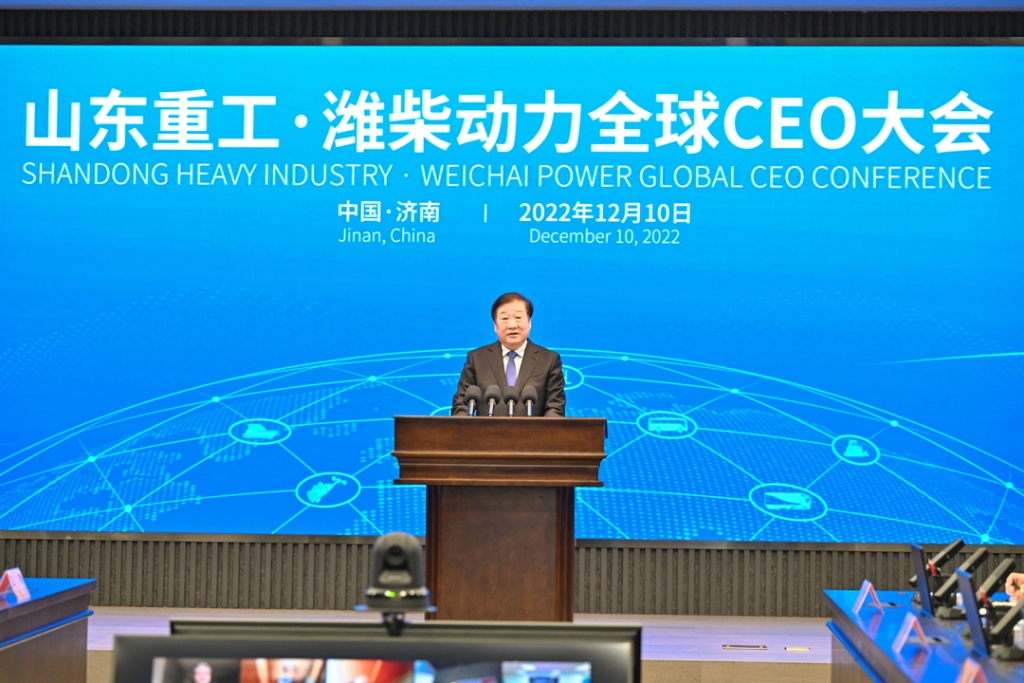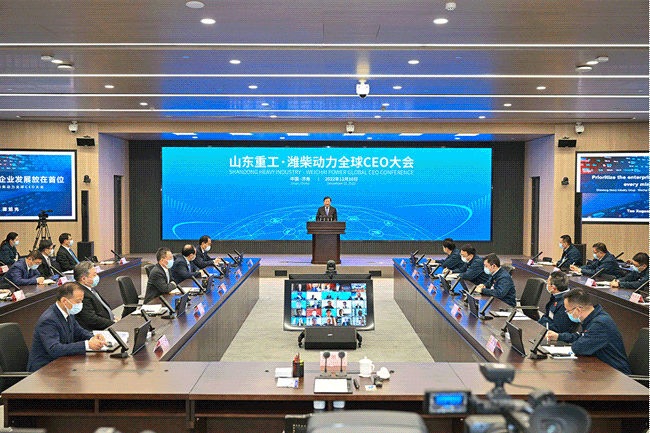 12月10日北京时间晚7:30,山东重工·潍柴动力第四次全球CEO大会在山东济南首次启用的全球总部大楼视频会议中心举行。全球主要公司的管理团队成员“线上+线下”参会。