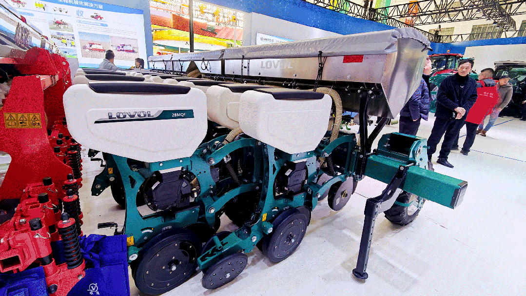 18公斤级大型轮式收获机、12公斤级履带式收获机、大马力CVT智能拖拉机、18行电驱精量播种机、电动拖拉机、液压翻转犁......在潍柴雷沃展区,琳琅满目的新型农机与成体系的大豆生产机械化解决方案吸引了参会嘉宾高度关注。