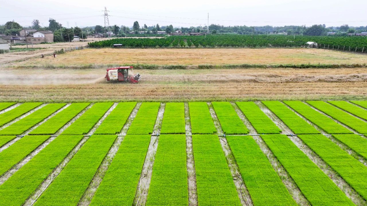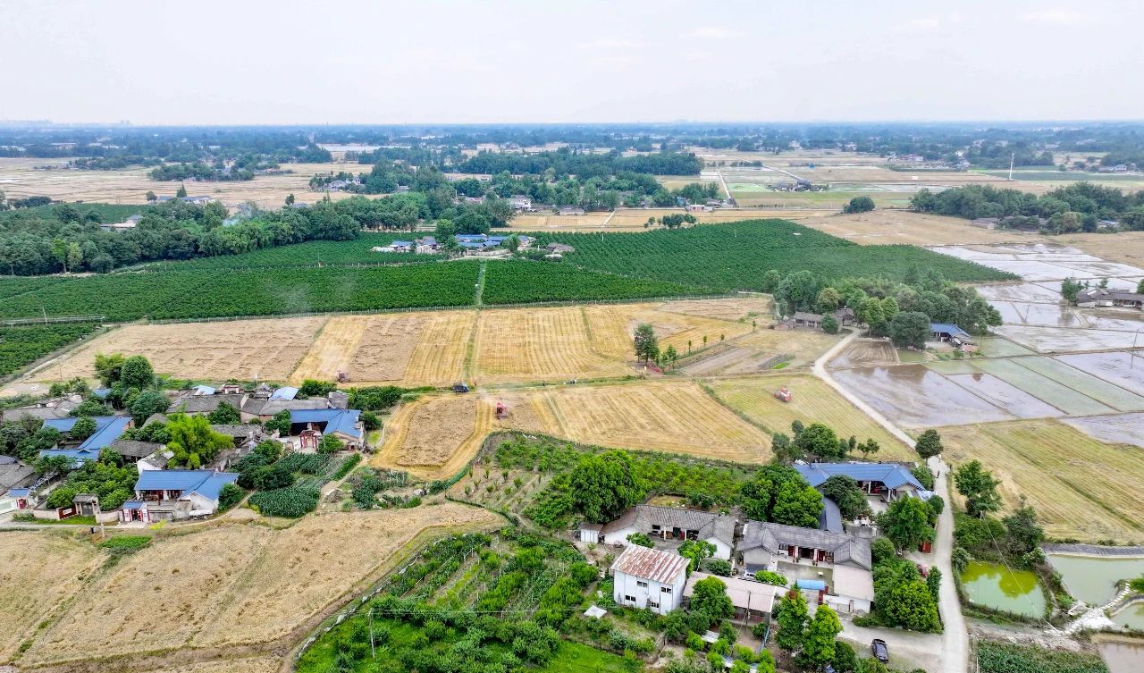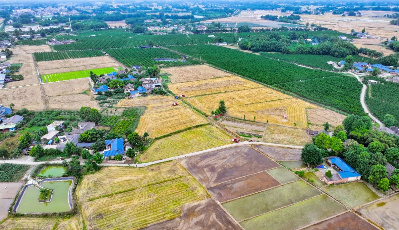 金灿灿的麦田、泛着浅绿的菜地、刚刚完成插秧的稻田,与远处的蓝天白云交相辉映,长江上游农耕文明数千年的传承中,“蜀中之蜀”呈现出一片物阜民丰的丰收图景。