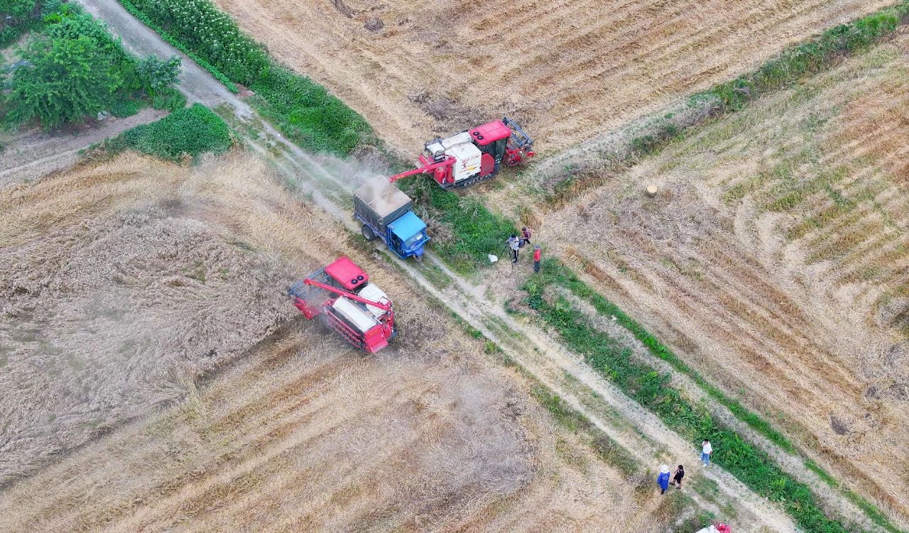 金色麦粒倾泻入仓后,农户们第一时间进行转运、晾晒。
