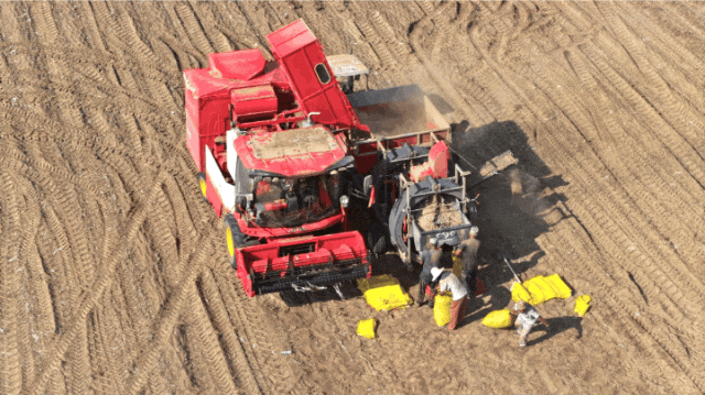 机器卸完花生果后,下一道工序随即开始,清土、装袋、运输……现场一派丰收的忙碌景象。“没有碎果,土也很少,这花生机收获质量真不错。”看着一袋袋干净、饱满的花生果,李大哥喜上心头。