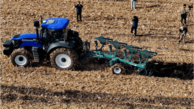 拖拉机技能比武现场,潍柴雷沃MW2104-6拖拉机搭载雷沃液压翻转犁,进行犁地整地作业演示。
