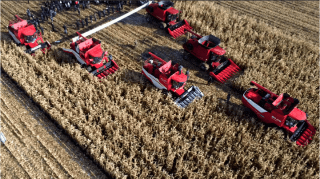 在玉米机收减损比武环节,5台雷沃谷神GK5126大喂入量收割机在玉米地里来回穿梭,收割、摘棒、剥皮、秸秆粉碎……一气呵成。据悉,该产品采用单纵轴流脱分技术,通过更换割台和脱粒部件可实现玉米籽粒、大豆、小麦等多作物的收获,具有一机多用、作业效果好、作业高效、可靠性高、维修方面等优势,尤其适用于东北、西北区域大地块作业。